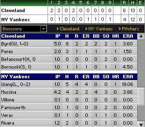洋基:Wang 32-20, Mussina 83-46, Villone 5-3, Farnsworth 20-14, Veras 10-4, Rivera 18-15